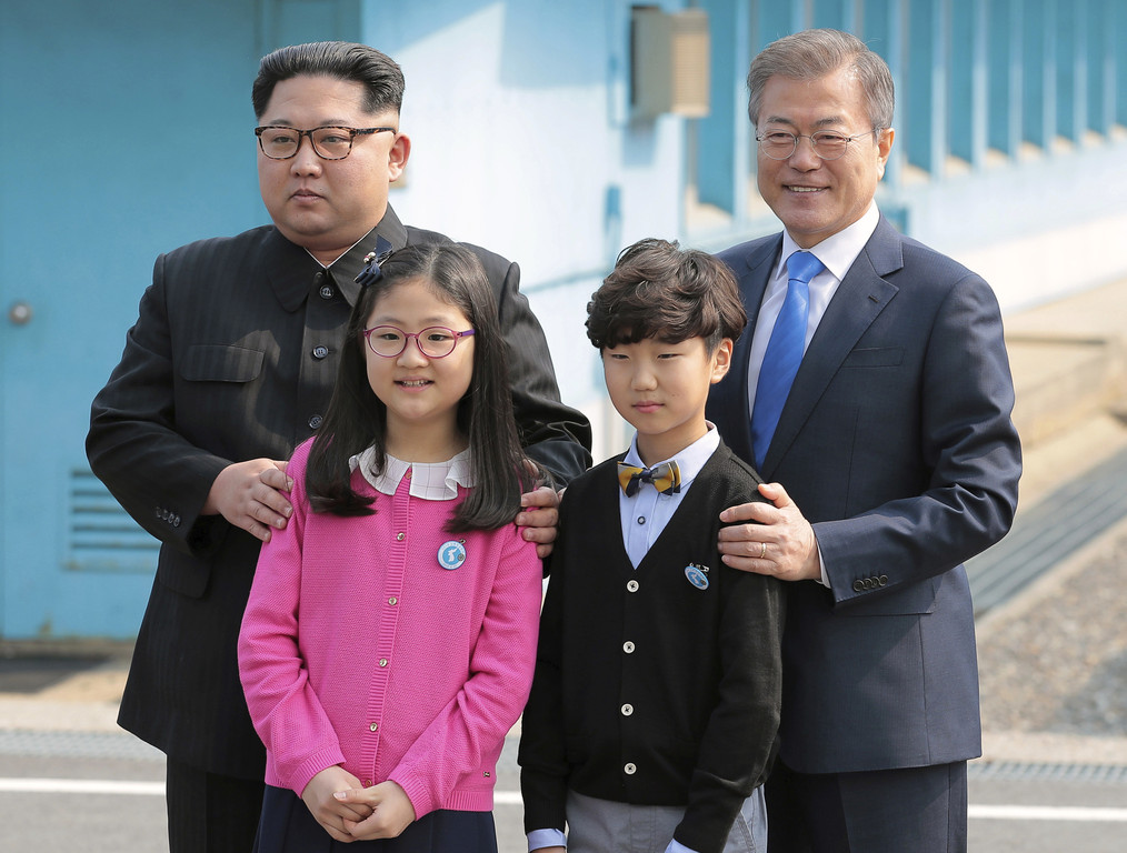 ▼金正恩與文在寅與兩名孩童合影,作為歡迎金正恩到訪儀式。(圖/達志影像/美聯社)