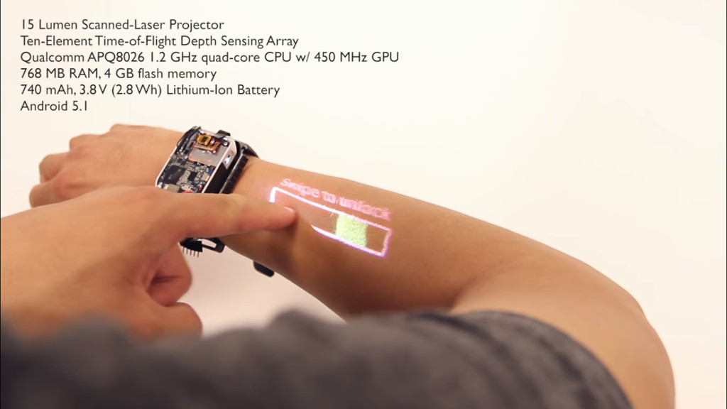 智慧型手錶的螢幕非常小,因此許多 App 在該領域的應用偏向運動、健身為主,若要增添可操控性,放大螢幕面積就本末倒置了。美國卡內基美隆大學研究人員就研發全球第一款,具備投影功能的智慧手錶,讓你的手臂自動轉變為操控螢幕,增添智慧攜帶式裝置的更多應用想像。