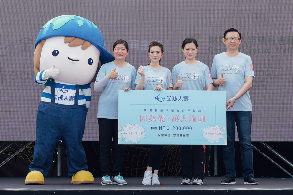 ▲全球人壽舉辦「因為愛‧萬人瑜珈」捐出部份報名費共20萬元,幫助忠義基金會的兒童。 (圖/全球人壽提供)