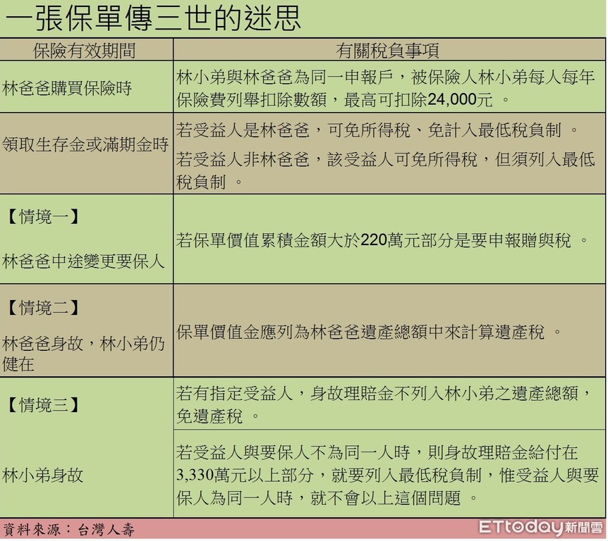 ▲林爸爸(要保人)為其子林小弟(被保險人)購買一張儲蓄險,林爸爸希望這張保單能傳承三代(父自益、父傳子、子傳孫)所衍生出所得稅、贈與稅、遺產稅三種不同稅負說明。(資料來源:台灣人壽)