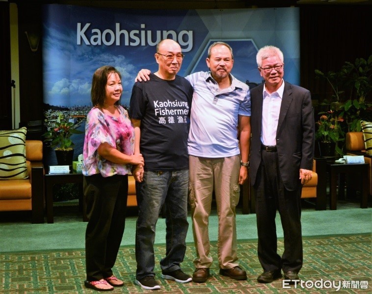 ▲鄧泰阮(左二)穿著自製T恤,和妻子淚謝宋謹安和黃宗舜(右二)的救命之恩。(圖/高雄市政府提供,下同)