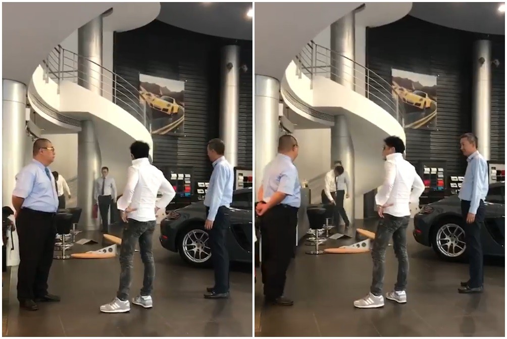 台中42歲朱姓男子2日下午開著保時捷休旅車凱燕,抄傢伙十字鎬等,衝撞南屯區展示中心,下車向員工嗆聲,被控告恐嚇、毀損,警方依現行犯逮捕。有恐嚇、暴力前科的他,從事土地開發,聲稱向車商以598萬元買Panamera,付了200萬元訂金,車子卻沒有加選配件,雙方談不攏,5天前竟收到存證信函,氣得衝撞店家;影片在臉書爆紅,網友大讚他「立領超帥」、「有錢就是霸氣」!