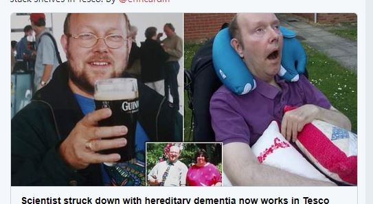 安德魯的太太薩拉(Sarah)說,「揮別原本的研究工作,先生仍決定自食其力持續貢獻社會,所以轉向到Tesco賣場擔任貨品上架員。」只可惜,在賣場工作一年後,安德魯的病情嚴重惡化,他再次離開工作,如今已經無法說話、進食以及走路。