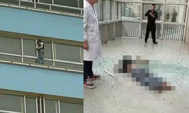 ▲▼袁男重摔到1號住院樓與2號住院樓之間的一條連接走廊上,鮮血染紅滿是碎玻璃的地面。(圖/翻攝網路)