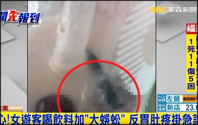 根據了解,日籍女遊客到台灣玩買了手搖飲料,快喝完了才在杯底發現一隻超大蜈蚣,日女恐懼說:「真的讓我非常的驚恐,現在想起來就很噁心,現在叫我喝任何飲料,我都會很害怕。」、「店員幫我插入吸管的,剛開始喝時就感覺味道怪怪的,大約還剩三分之一時,看了才發現有一個黑色長條形的物體。」