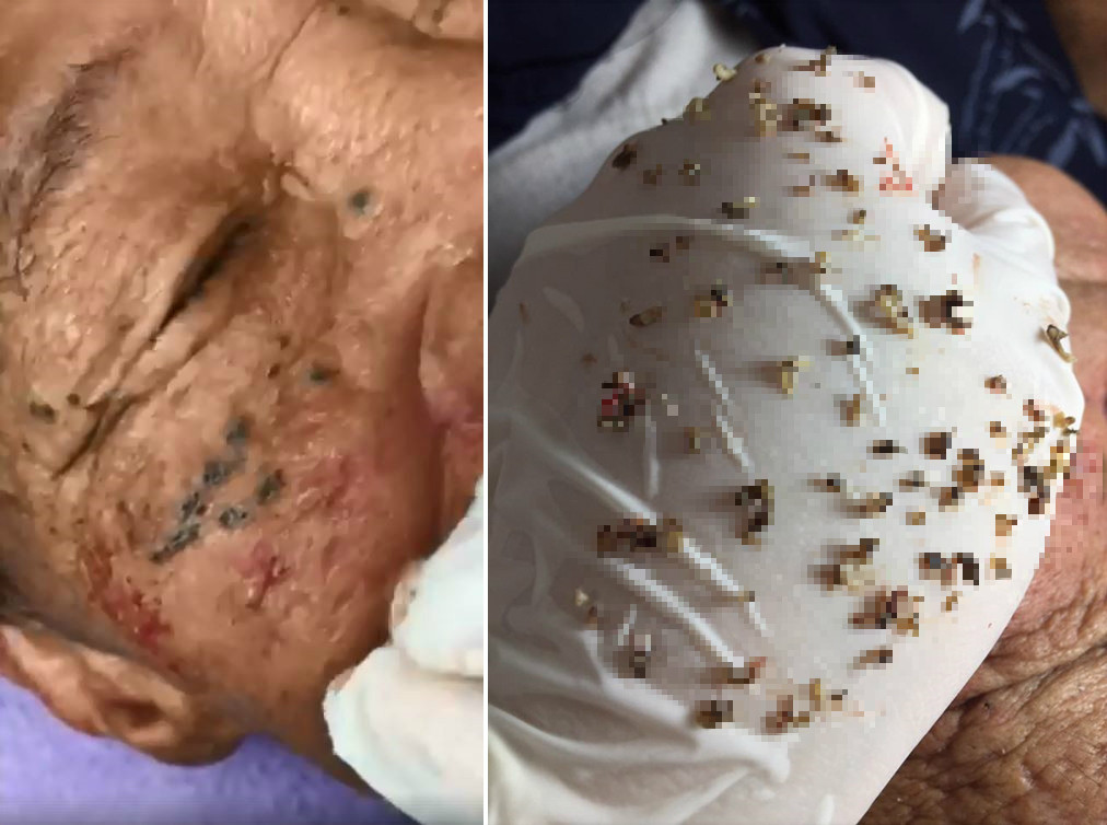 從影片畫面中可以看見,粉刺遍布阿伯的臉上,長滿在左右臉頰、額頭、太陽穴、鼻頭處,其中左臉頰一排7顆連線的「衛星粉刺」最受人矚目,但拔除工程也比較耗時。只見美容師先從太陽穴附近下手開挖,一條超黝黑的條狀物才瞬間噴出。