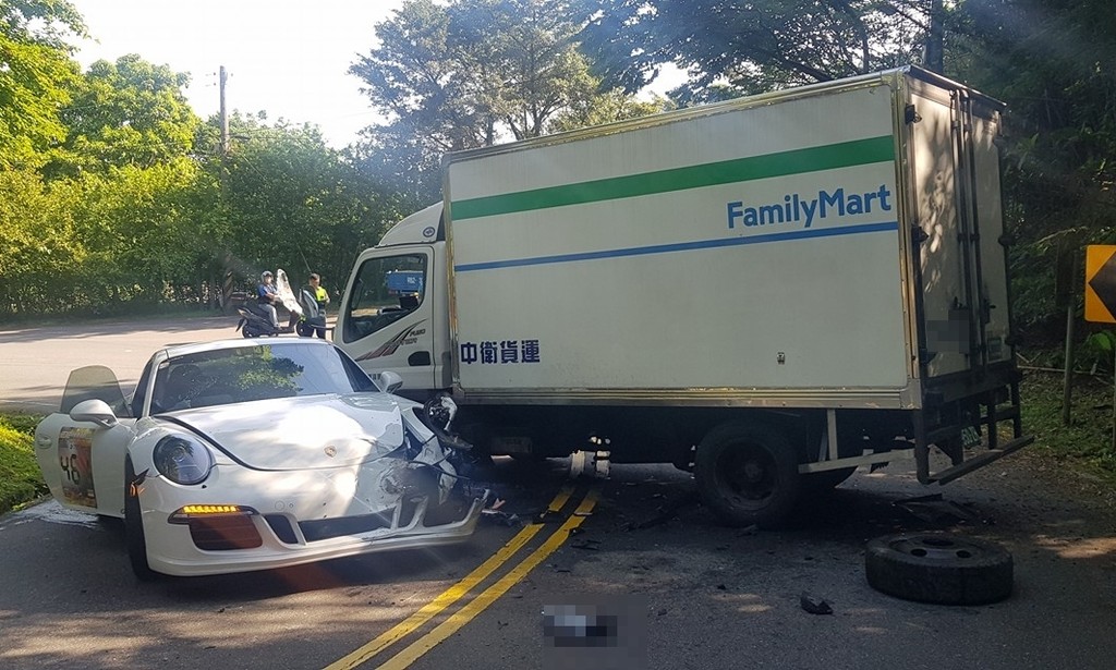 新北市汐止區汐平路一處彎道6日上午發生對撞車禍;當時葉姓男子駕駛超商物流車自平溪方向往汐止行駛,行經事故彎道處時疑似未抓好入彎角度,與對向的白色保時捷跑車猛力對撞,導致保時捷左側車頭稀爛全毀;而物流車油箱也被撞破,汽油頓時灑了一地。雖然目前肇事責任尚未釐清,但這輛保時捷毀損甚鉅,粗估維修費用至少要200萬元,後續賠償處理恐令葉男吃不消。