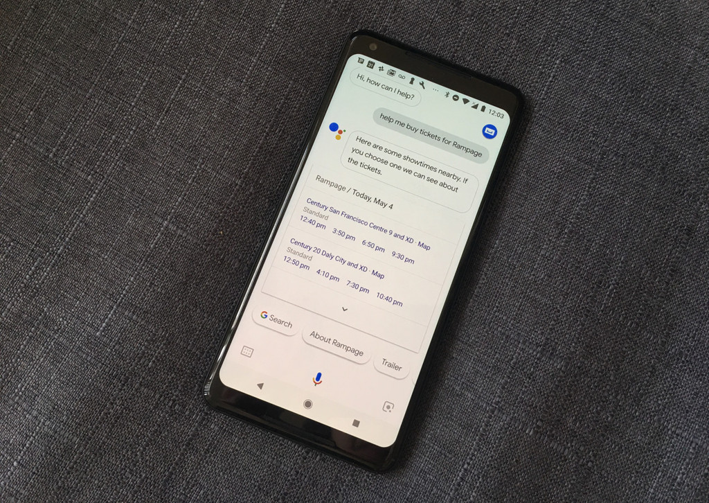 將想要看的電影告訴 Google 助理後,系統會依據 GPS 定位來搜尋附近的電影院,並列出電影時段,使用者選擇後還可以挑選座位,透過語音指令就如同使用電影 App 一般,至於結帳的部分則是支付給 Fandango,不需要連結網頁或是開2啟 App,官方介紹影片中展示,直接透過 Google Pay 完成付款即可。
