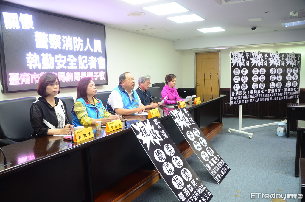 ▲台南市議員曾培雅、蔡淑惠、林美燕及前台南市警局長、市長參選人陳子敬,共同關心警消人員權益。(圖/記者林悅攝)