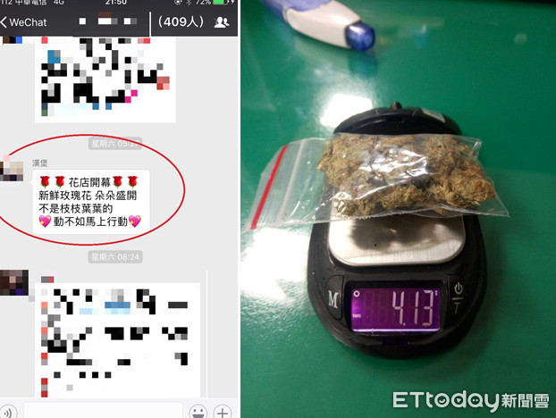 警方調查,20歲林姓犯嫌在微信中化名「漢堡」,在公開群組「小愛舒服可廣支援」中以「玫瑰花」作為暗語,張貼「花店開幕,新鮮玫瑰花,朵朵盛開,不是枝枝葉葉的,心動不如馬上行動」的暗號,公開張貼販賣二級毒品大麻訊息,以招攬不特定人向他購毒。
