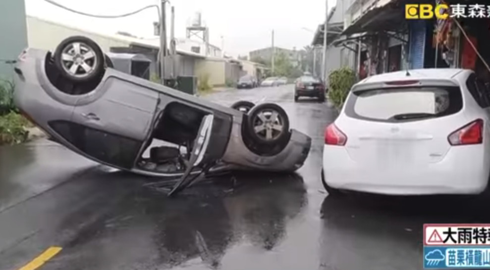 ▲雲林一名鄭姓駕駛因為「閃車沒注意」,撞到路邊臨停的轎車,導致整輛車翻覆。(圖/東森新聞,下同)