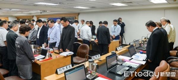 ▲市政會議一開始,先由鄭文燦率市府團隊為敬鵬平鎮廠大火殉職6消防弟兄默哀後,隨即發布由龍榮森代理消防局長。(圖/桃園市政府提供)
