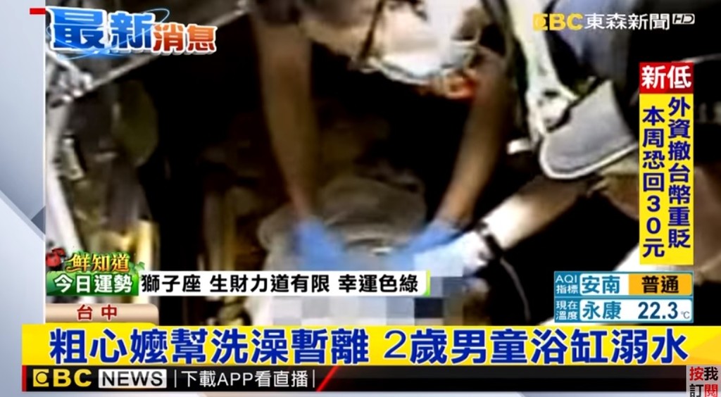 台中豐原區一名張姓曾祖母9日晚間7點多,正在幫2歲鄭姓曾孫洗澡,期間聽到另一名曾孫(男童哥哥)在浴室外哭鬧,隨即放下曾孫出門查看,沒想到約2分鐘後回到浴室,就發現曾孫已經浮在水面上,臉色慘白沒有呼吸,趕緊將曾孫抱出屋外求救叫救護車,男童緊急送往豐原醫院後,目前仍在加護病房治療。