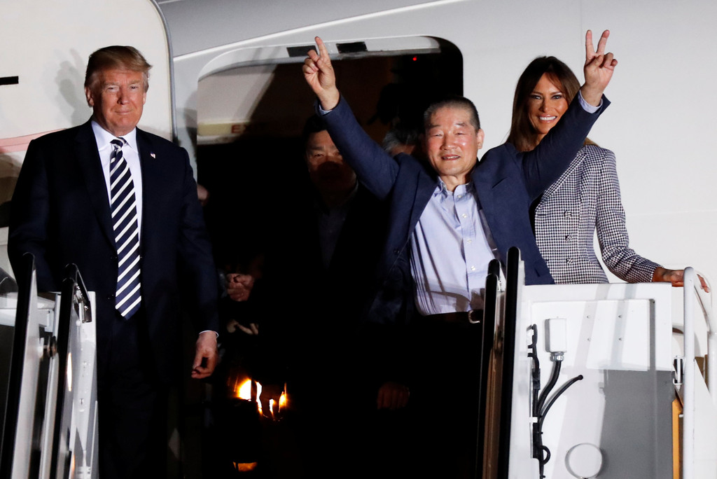 載有3名北韓人質、醫療設備較完善的班機則在10多分鐘後降落,就在班機就定位後,川普夫婦上機與獲准釋放的金尚德(英文名托尼・金、Tony Kim)、金學成(Kim Hak-song)與金東哲(Kim Dong Chul)先在機上會面。歷經幾分鐘的時間,川普夫婦先步出機身、帶領3人走出來,可見3人高舉雙手並比出「YA」的手勢,並在班機前方接受媒體記者的聯訪。