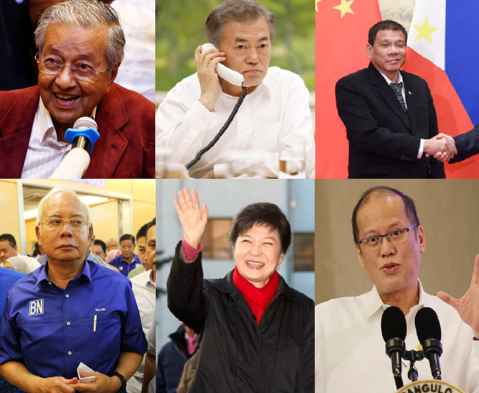 ▲從左到右為政局大變的3國現任、前任領導人:馬來西亞(上馬哈迪,下納吉)、南韓(上文在寅,下朴槿惠)、菲律賓(上杜特蒂,下艾奎諾)。(組圖/路透/達志影像/美聯社)