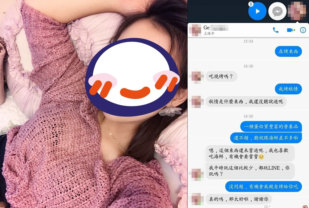 節途中,正妹開頭先很有禮貌的打了聲招呼,便開始閒話家常了起來,「哈囉,在做什麼呢?」蘇男雖然發現她的帳號不尋常,但也很勤勞回覆,「在烤東西」。妹子見成功搭上話,自然不會放過進攻機會,「吃燒烤嗎?」「我烤秋情」。