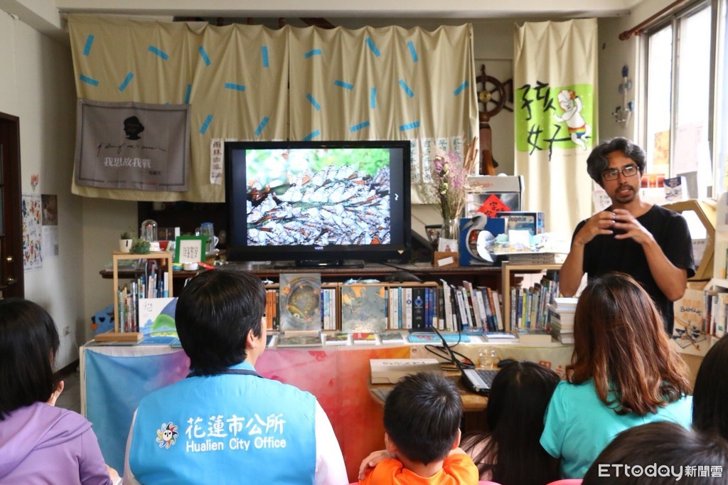 系列講座自上星期六起,在花蓮市各個獨立書店陸續進行。活動首場在「孩好書屋」舉行,市公所邀請到繪本作家陳旻昱(玉米辰)來分享他個人繪本創作的初衷。他清晨起就開始了環繞半島的旅程,從台中的沙鹿來到花蓮,他以高雄工廠偷排廢水與下水道建置以及紫斑蝶的遷徙為例,透過他個人創作的繪本與動畫,從中傳遞不同的環境議題和生態知識,同時每個故事都緊扣著台灣這塊土地上所發生的現象。