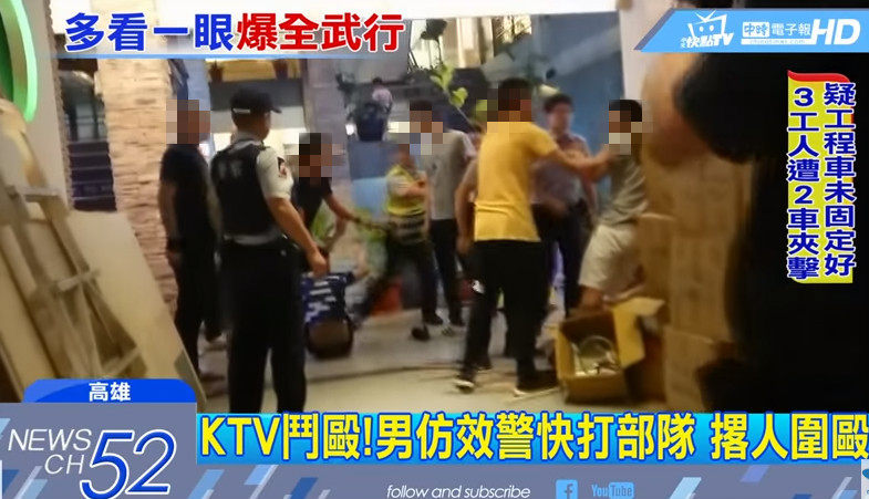 高雄鼓山區某KTV店11日凌晨爆發鬥毆事件!張姓、蔣姓男子疑似互瞄後爆發衝突,2人都撂人助陣,一行人一路從KTV後方停車場打進店內,直到警方「快打部隊」到場後,仍無法阻止怨氣,繼續發生肢體衝突,場面相當火爆。警方將5名男子帶回,全案依違反社會秩序維護法送辦。