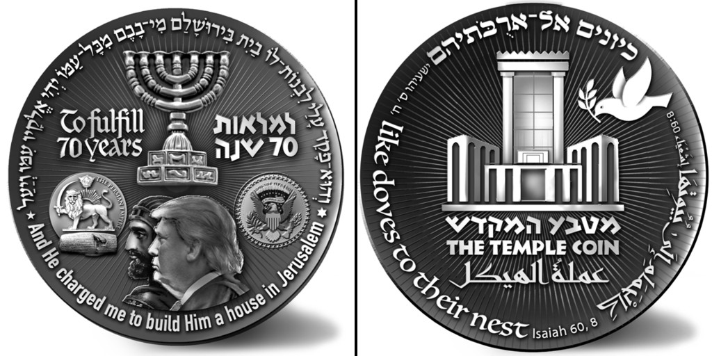據《福斯新聞》報導,以色列非營利教育組織「Mikdash」將發行「聖殿硬幣」(Temple Coin)來紀念以色列獨立70周年,硬幣上用希伯來文寫著《聖經》經文,除了印上川普頭像及美國政府標誌,古代波斯帝國國王「居魯士二世」(King Cyrus)的頭像也出現在硬幣上,據《聖經》記載,2500年前居魯士二世曾允許猶太人返回耶路撒冷。