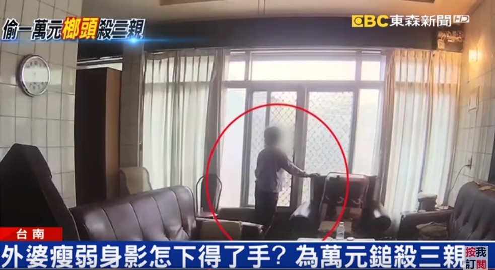 畫面中,一頭白髮、瘦弱的阿嬤輕扶著沙發走進客廳,接著一如往常走向大門口伸手解開門鎖,探頭看了看後開門緩步走出院子,身影最後在監視器畫面中慢慢消失。在母親節前夕見到阿嬤如此慈愛、瘦弱的身影,辦案的刑警看了也為之鼻酸,只要一想到阿嬤最後竟然是遭到一手帶大、疼愛的外孫殘忍槌殺,更忍不住流下淚來。