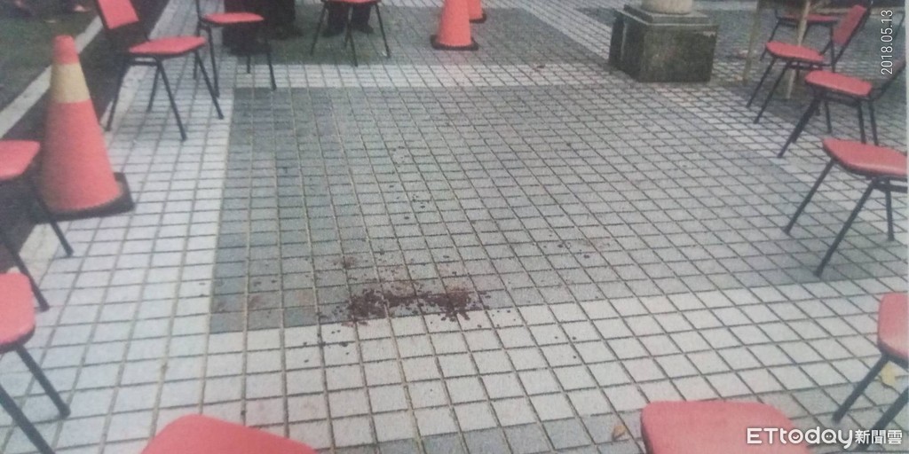 ▲台南市南區大林新城中庭廣場發生兇殺案,1人被刀刺殺送醫,現場血跡斑斑。(圖/記者林悅翻攝)
