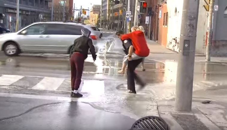 ▲民眾遇到積水不知所措,加拿大警察二話不說背起對方穿越馬路。(圖/取自Youtube/CityNews Toronto)