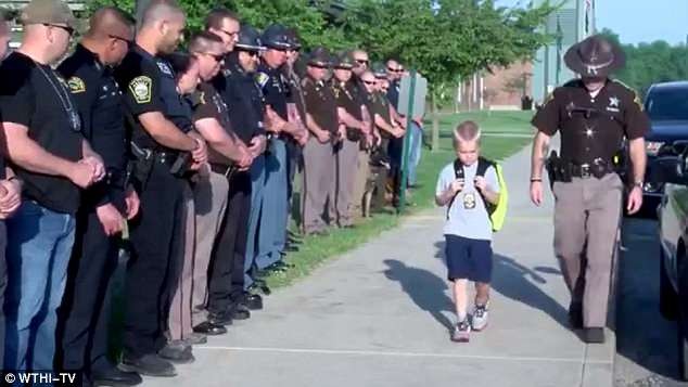 美國印第安納州特雷霍特(Terre Haute)一名5歲男孩的父親是警察。但父親上 周在一場警對峙駁火中不幸中槍殉職,讓小男孩頓 時失去了父親。 本周一(14日),這名殉職員警的70名同袍代替男孩的父親護送孩子上學 ,在學校門前列隊致意,場面哀傷感人。