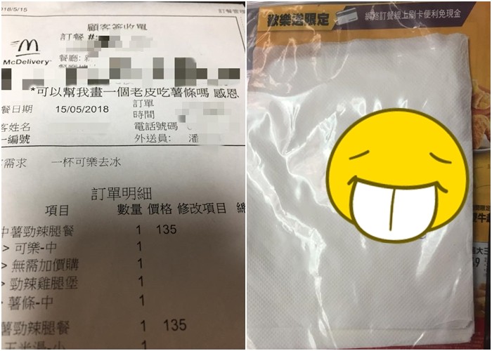 只見外送的餐巾紙上,真的畫了一個《探險活寶》卡通裡的角色「老皮」,而且正在吃著麥當勞薯條,許多網友看了相當驚艷,紛紛大讚「 要是我一定很開心」、「超可愛的啦」、「看了就想秒讚」、「強,佛心來著」、「其他門市表示:靠,你要逼死誰啊你!」、「下次我要把微積分作業給他們請他們幫我算」、「我朋友叫麥當勞的外送人員幫他買7-11小美冰淇淋,說因為失戀」。