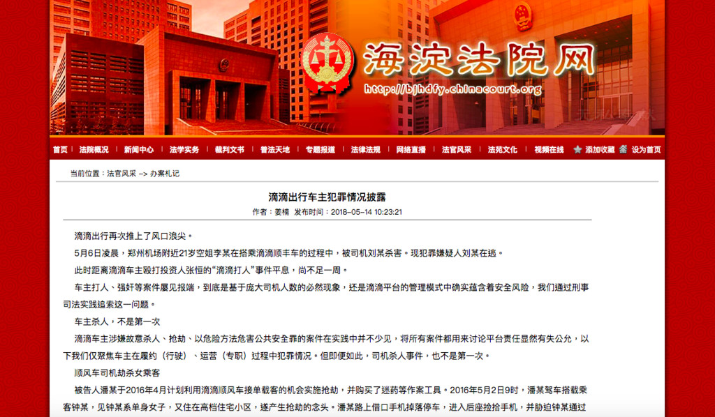 大陸一名21歲空姐在搭乘「滴滴順風車」時遭到劉姓司機殺害,儘管嫌犯事後證實溺斃,卻也引起大陸輿論關注網路叫車平台的安全性。讓外界訝異的是,北京海淀區人民法院法官姜楠發文指出,滴滴平台近三年發生的案件「數量遠高於公眾所知」。