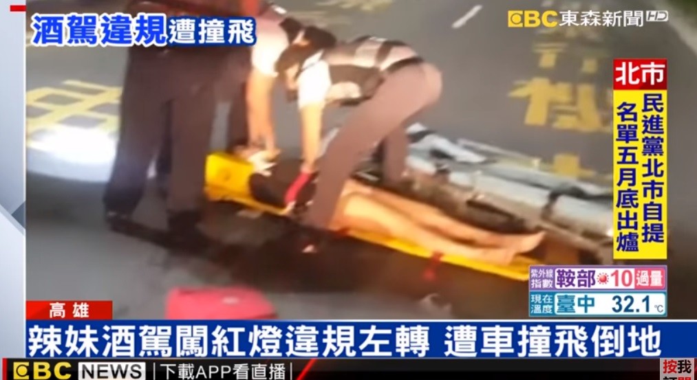 當時黃姓女騎士原本在路口等紅燈,但下一秒她卻闖紅燈而且違規左轉,這時25歲的簡姓駕駛開車經過路口,閃避不及直接撞上,她被撞倒地哀嚎,安全帽、眼鏡和手機等物品也都噴飛一地,簡姓駕駛趕緊報警,救護人員將她送上救護車送醫,不過經抽血檢查後,發現她酒測值竟然高達1.08毫克。