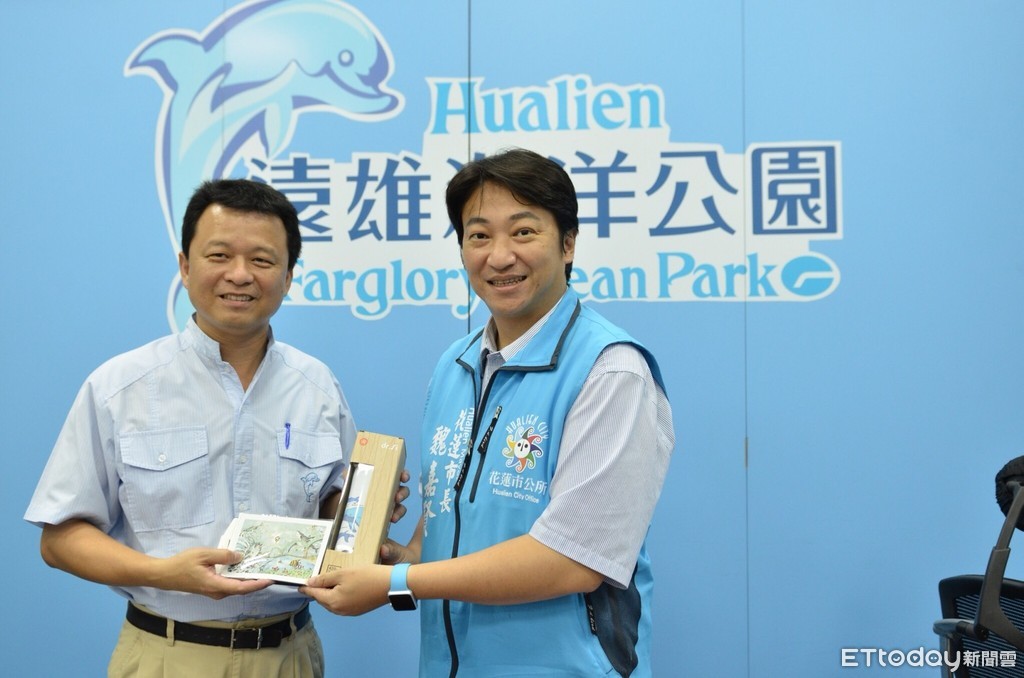 ▲花蓮市長魏嘉賢拜會遠雄海洋公園總經理沈建劭,針對「2018花蓮太平洋縱谷馬拉松」活動期間提供優惠活動尋求共識。(圖/花蓮市公所提供 下同)
