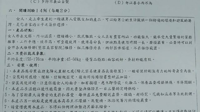 學校應該是教導學生正確價值觀的地方。但有網友爆料,台北市景美國中的國文段考試題中,竟出現物化女性的題目,「女人為上帝生產讓男人愛恨交加的產品,可重複使用,使用壽命長,但缺點是使用時間一長,磨損嚴重,必要時,可到全市各大維修部(整容美容醫院)維修。」