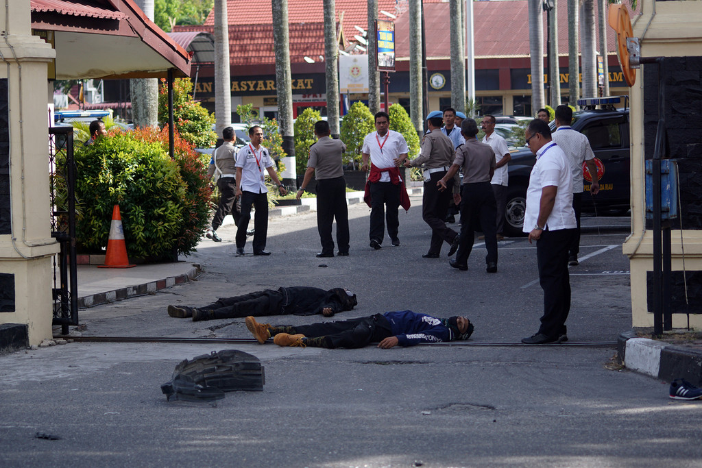 印尼近日連續傳出多起恐怖攻擊,16日上午又有5名與伊斯蘭國有關連的激進份子,手持武士刀攻擊廖內省首府北乾巴魯(Pekanbaru)的警察總部,造成多人受傷。其中1名攻擊者駕車衝撞,造成1名警察死亡。警方當場擊斃4人、逮捕1人。這已經是近日印尼發生第3起與IS有關的恐怖襲擊。