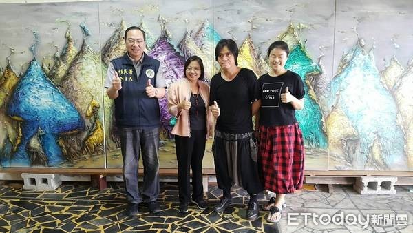 ▲移民署桃園市服務站主任林萬益(右一)、文化局長莊秀美(右二),參訪新住民油畫家梁全威甫完成的「臺灣多元文化特色藝術工作室壁畫」。(圖/移民署桃園市服務站提供)