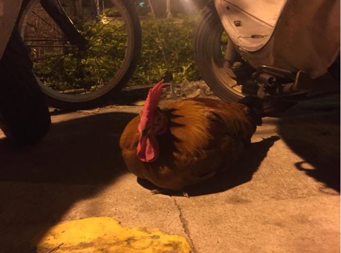 一名網友在臉書社團「爆廢公社公開版」貼出一張照片,畫面中可以看見,兩台並列機車中間有一隻公雞,極為悠閒坐在此處,一點也不受他人干擾。讓原PO在貼文處寫下,「在家樓下看到雞該怎麼辦?我該抓去燉嗎...?」