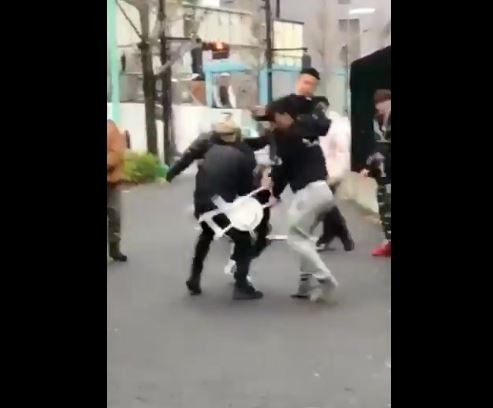 Supreme澀谷店9日發售限量商品吸引大批人潮提前到場排隊,保全懷疑其中一大群人可能是傳說中的「排隊黨」,專門購買限量商品再到網路上轉賣,便要求他們離開,引起雙方發生肢體衝突。影片拍到,這10名中國男子不但怒罵保全,還團團圍住對方進行攻擊,其中還有人拿起排隊等候時坐的鐵椅猛砸,下手時的狠勁嚇壞一旁路人,大家都不敢上前搭救。