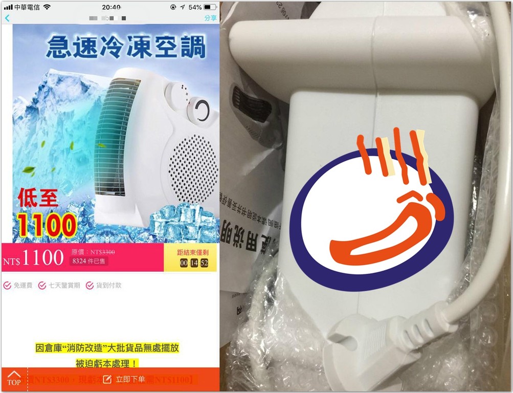 女網友說,「這麼個大熱天你說商品吹不涼就算了,他媽媽的你拿加熱器賣我也想騙我的錢喔?」不過好在宅配人員因趕時間,加上社區警衛那時剛好不在,所以對方只將貨放置警衛室並未收款,所以他們很順利的將商品退回,隔天也致電說明退貨原因。