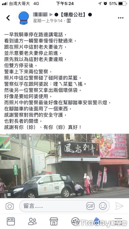 ▲民眾對於員警能夠主動發現有需要的民眾,積極為民服務的認真態度大受感動,於是拍照在臉書社群PO文,直擊台南最美的景色。(圖/記者林悅翻攝)