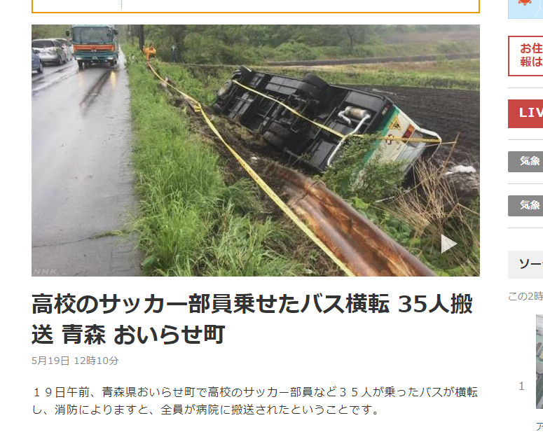 日本青森縣奧入瀨町一輛巴士於19日上午9時30分左右翻覆,造成車上35名高中足球隊員、3名大人全被送至醫院。目前尚不清楚傷患傷勢的程度,但受傷乘客的意識都很清楚。