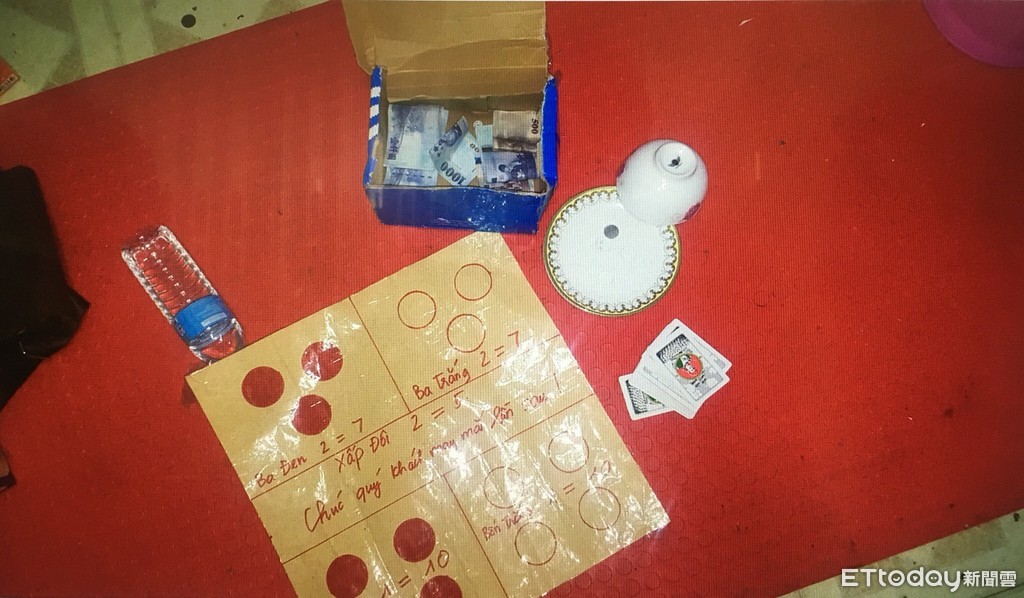 ▲台南市警歸仁分局,查獲越南籍黃姓逃逸外籍移工主持之越南骰子賭場,經清點共有12名賭客,賭資新台幣6千元。(圖/記者林悅翻攝,下同)