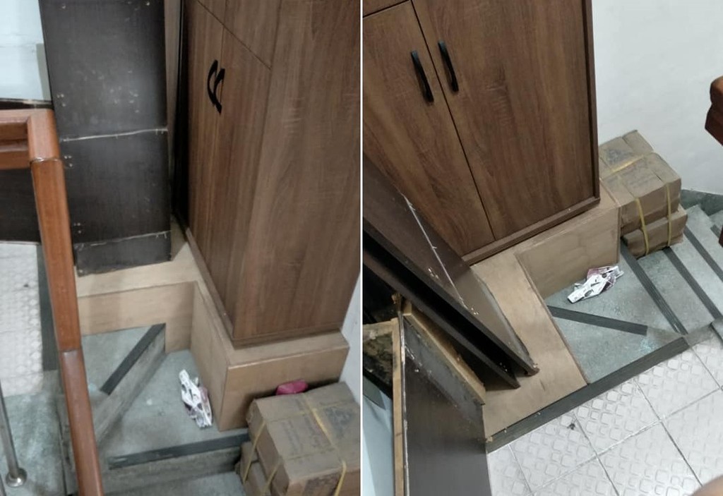 照片中,只見原本就不算寬敞的樓梯轉角處被人用木板架高,上頭則擺著一些家具隔板和一個大木櫃,硬是占據轉角空間將近四分之三,導致其他人下樓只能小心翼翼踩著僅剩下一塊「小三角形」的階梯,看起來相當危險。