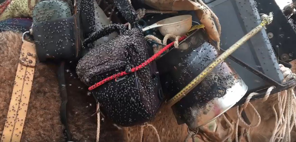 哈柏表示,「雖然我們有帶蒼蠅網,但是當我們停下來休息時,我回頭看了一下我的駱駝,牠的頭部、還有馬鞍整個都佈滿了一團團黑點,這是我旅行生涯以來第一次看見這麼多的蒼蠅。」
