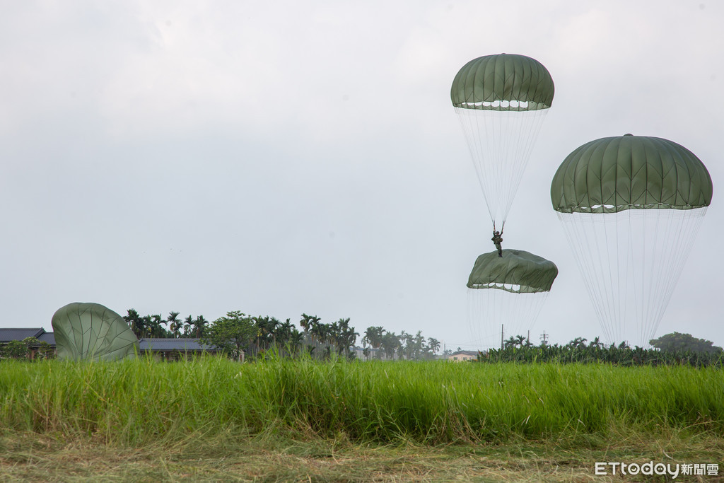 過程中,C-130運輸機首度進航時,因航線問題「空圈」一圈,二度進場後開始肩連4波人員跳出,首波為1名試風員,其餘18名教官則區分3波,每波6人跳出,全數精準著陸;而航特部政戰主任武立文也指出,傘員落地並收傘完畢、步出訓練場後,必須「用跑的」,以檢視傘員有無受傷。