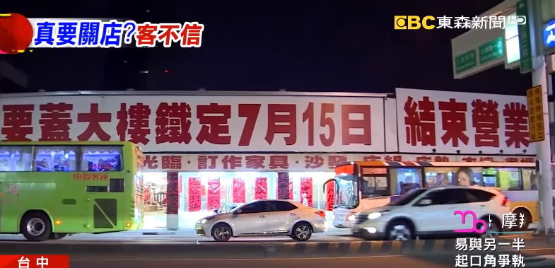 台中市環中路、中清路有許多家具店,經常可看到店家掛出「全館特賣、出清價、賠本賣」的布條,廣告噱頭打很大,看在台中人眼裡早已見怪不怪。現在一間家具業者貼出布條「鐵定7月15日結束營業」,又被不少民眾以為又是老伎倆,但老闆強調,店面要蓋大樓,連日期都訂好,打包票是真的要關店。現在也吸引不少消費者搶便宜。