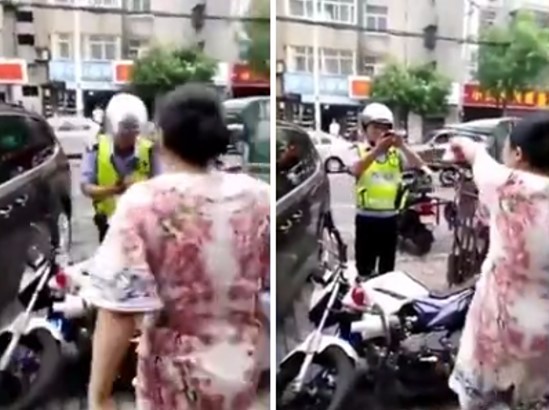 江蘇省連雲港市一名經營酒店用品的女店長不滿交通警察取締門口的違停車輛,認為這樣會影響自己的生意,竟然直接出手推倒警用機車,接著又朝警員胯下猛踢好幾腳,導致對方脖子抓傷、左腿瘀青以及睪丸發炎,最後反而被依妨礙公務帶回警局。