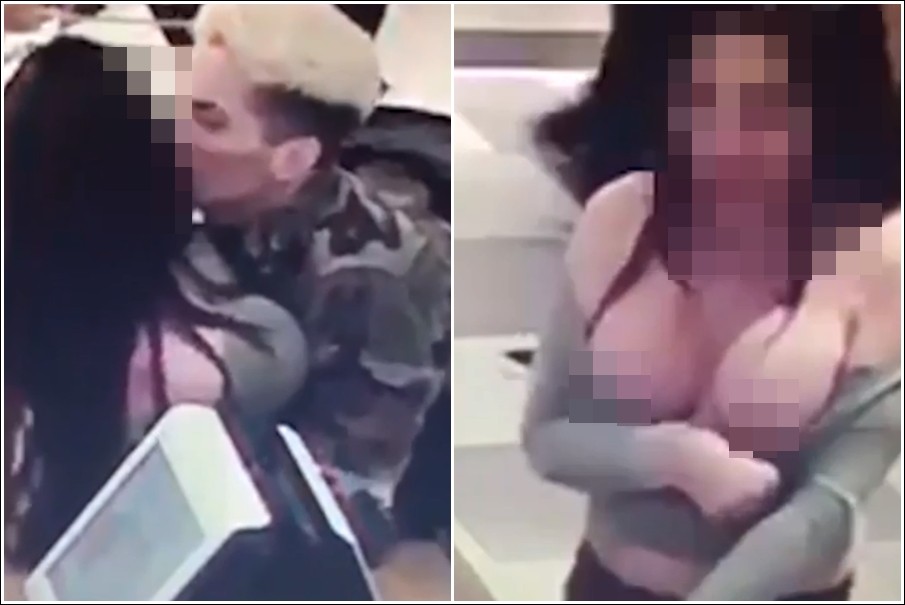 這名女子在櫃台前和店員聊天時故意扯衣服,左搓右揉露出乳房,接著和一名男子上演「女上男下」肉體交疊的性姿勢,最後她還大方裸露自己F罩杯以及身穿的丁字褲,誇張的行為讓現場民眾全看傻眼。