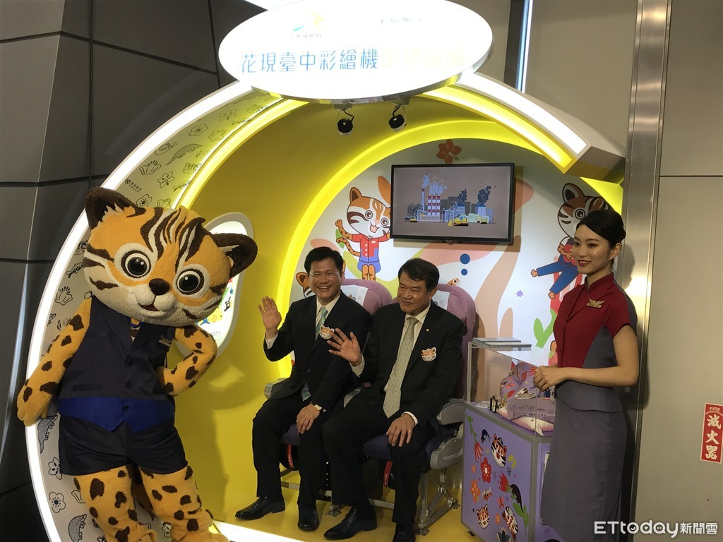 ▲航空公司特別在台中機場布置花博機艙意象專區,讓旅客體驗拍照,圖為市長林佳龍與華航集團董事長何煖軒現場體驗。(圖/記者李忠憲攝)