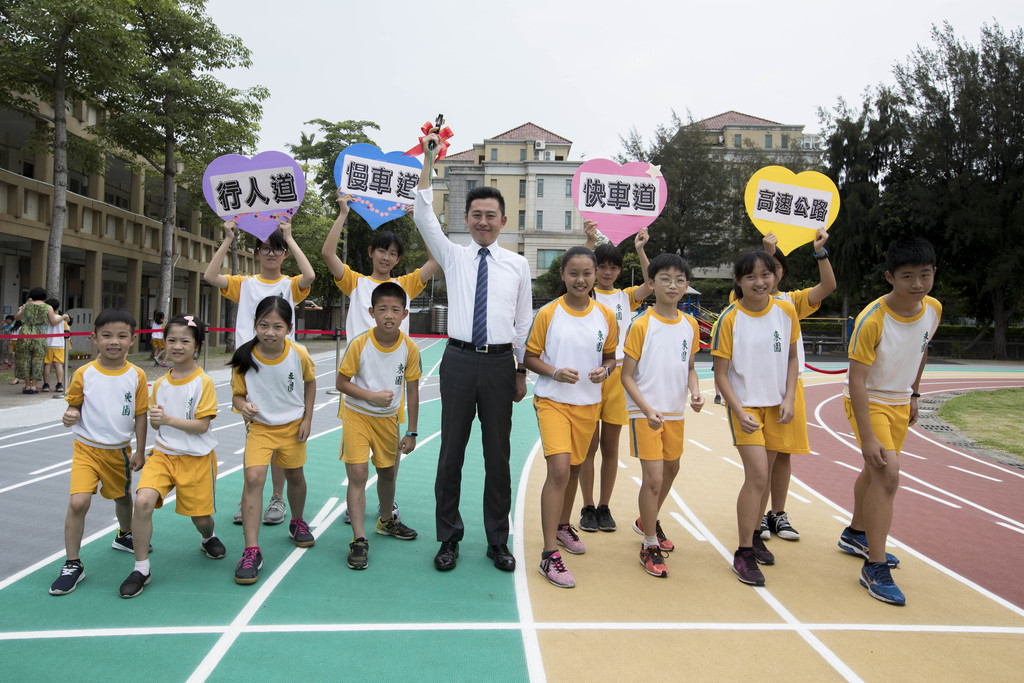 跑道為四色八道,由內而外安排「高速公路」、「快車道」、「慢車道」,以及各年齡層都能輕鬆步行的「行人道」,今日田徑隊、中年級、低年級、幼兒園更分跑道進行趣味競賽,在市長林智堅鳴槍後開心試跑,輕鬆進行分級分速競賽。