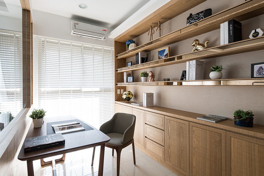 移除隔牆後的房間,被賦予複合機能,收納木櫃牆的高實用性與活動書桌椅特意搭配,現在的書房用途,日後可視需求加裝捲簾,彈性變更為客房、兒童遊戲室或再一間獨立小孩房,不僅視野與光照擴散至最大值,空間效能亦充分發揮。