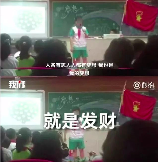 大陸《四川電視台》報導,浙江杭州西湖小學16日舉行主題為「我有一個夢想」的演講比賽。這名五年級的小學生上台後就語出驚人,表示夢想顧名思義,就是做夢都想。做夢都想的事情一定是一個人內心最渴望的。只有最渴望才能花全部去追尋。人人都有夢想,而「自己的夢想很簡單,那就是發財。」